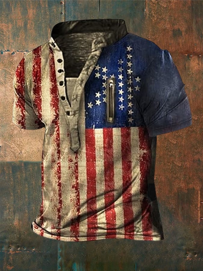 Men's Vintage Independence Day Flag Henley Neck T-Shirt