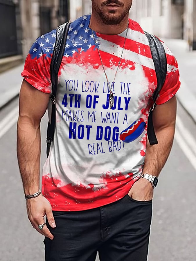 Men's Independence Day Hot Dog Print Casual Short Sleeve T-Shirt