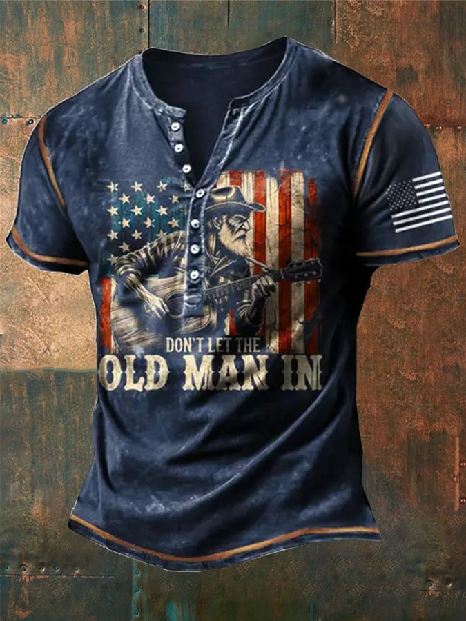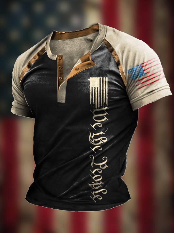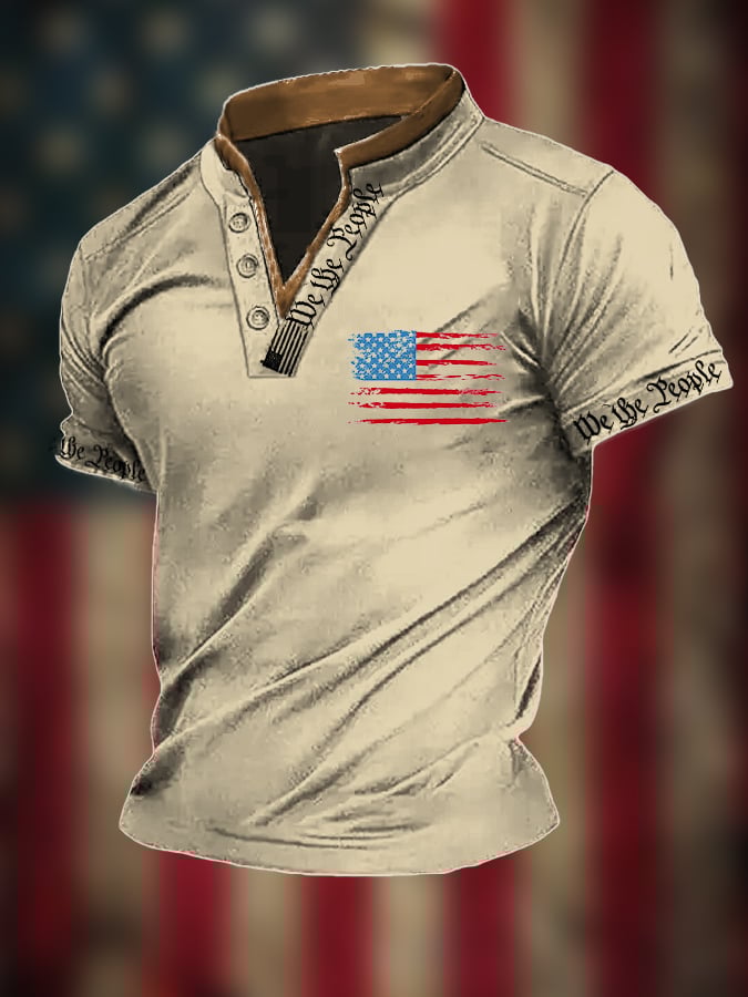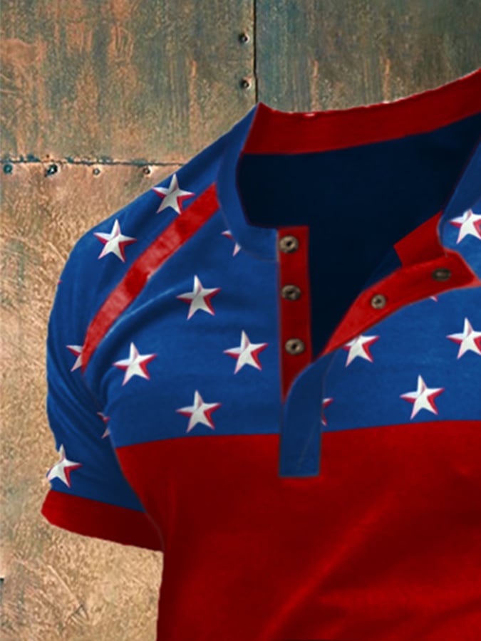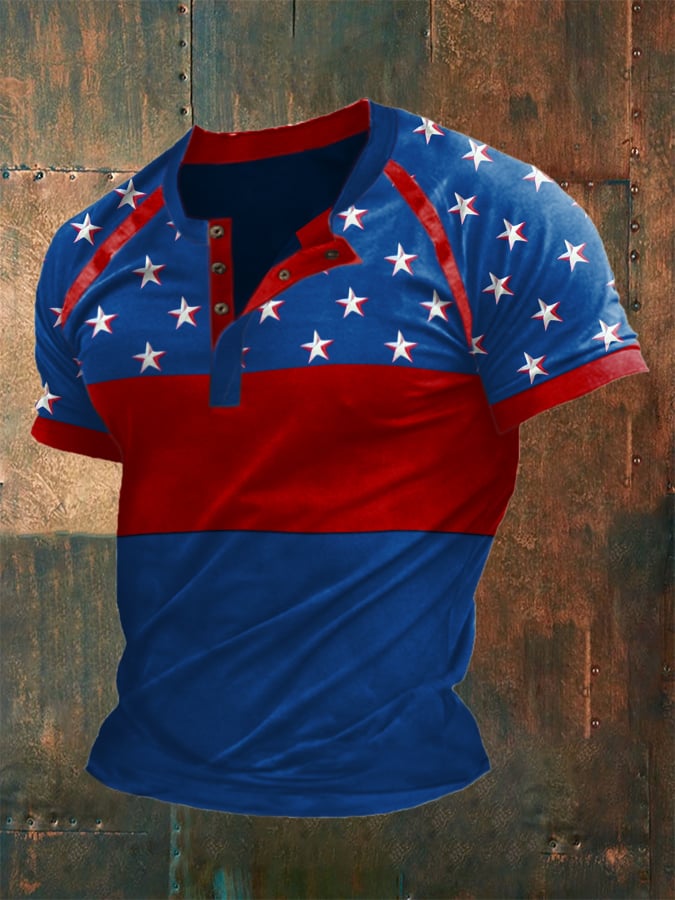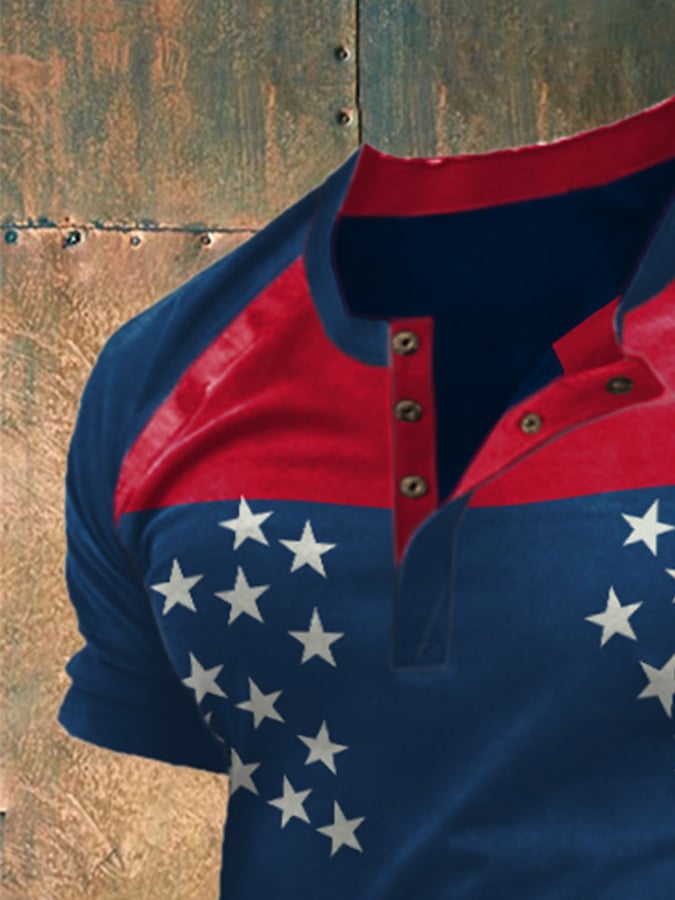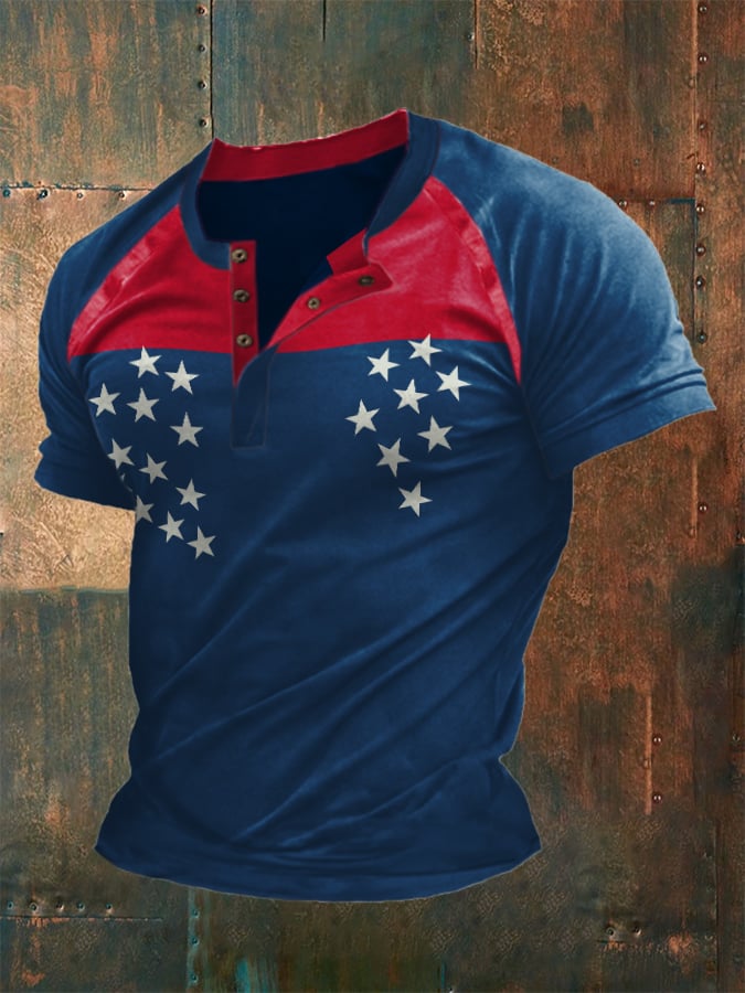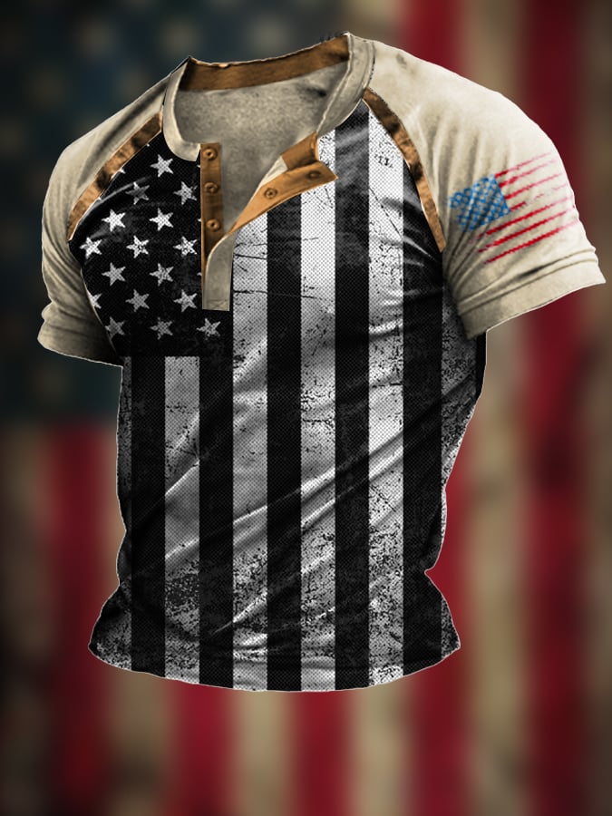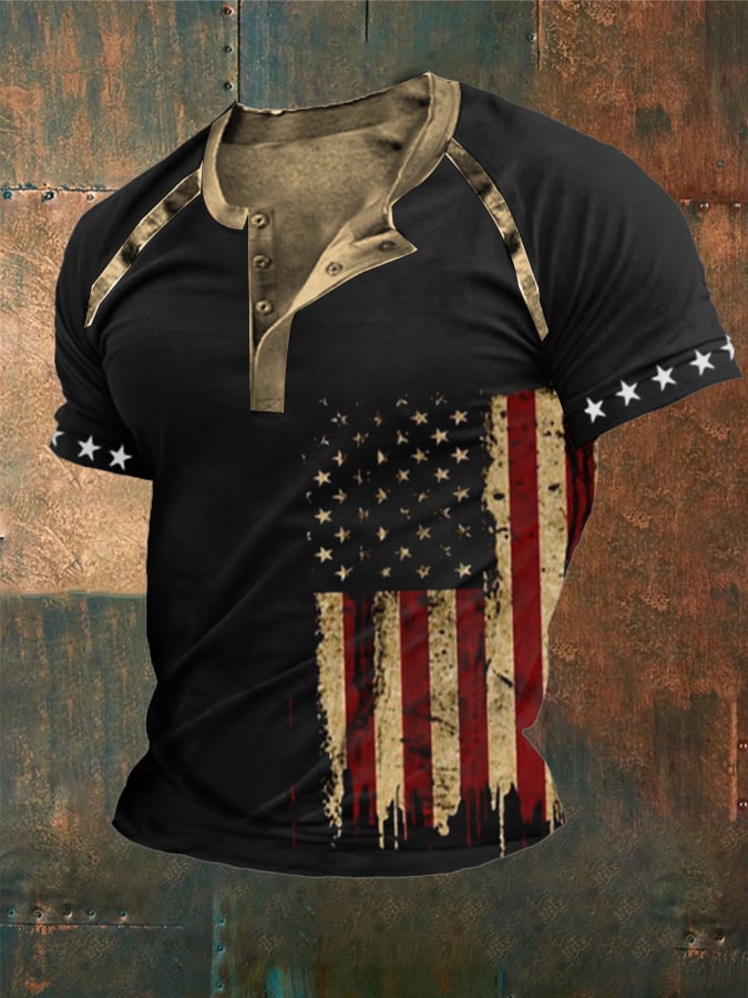 Men's Vintage Patchwork Flag Independence Day Henley Neck T-Shirt