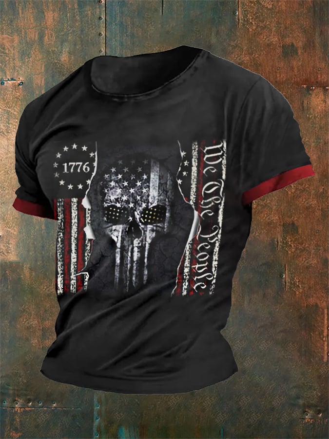 Men's Skull We The People 1776 Vintage America Flag Print Independence Day Casual Tee