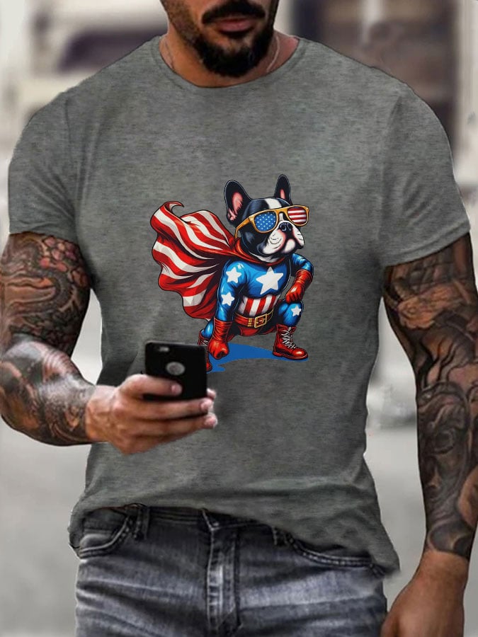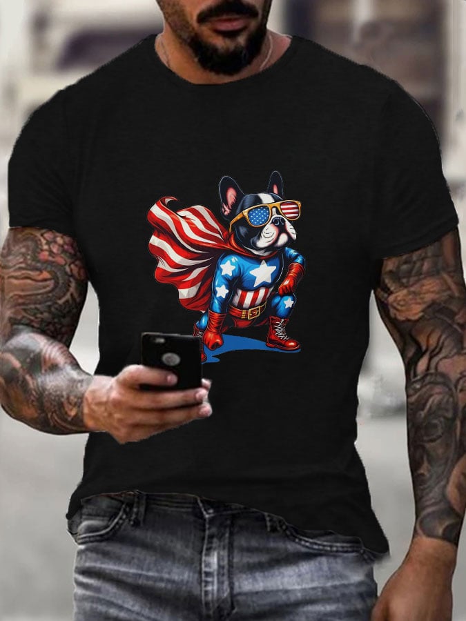 Men's Independence Day Superman Bulldog Print T-Shirt