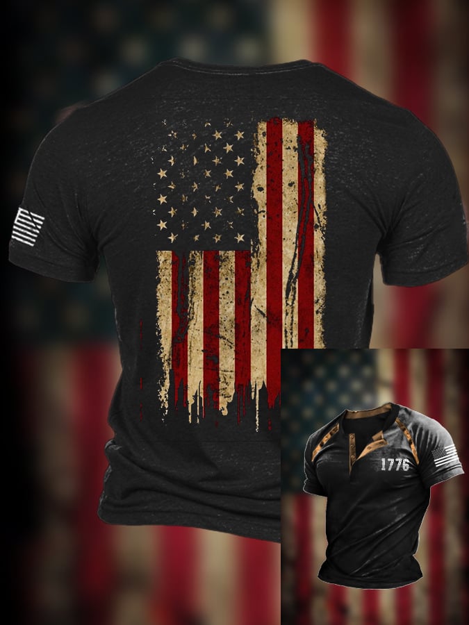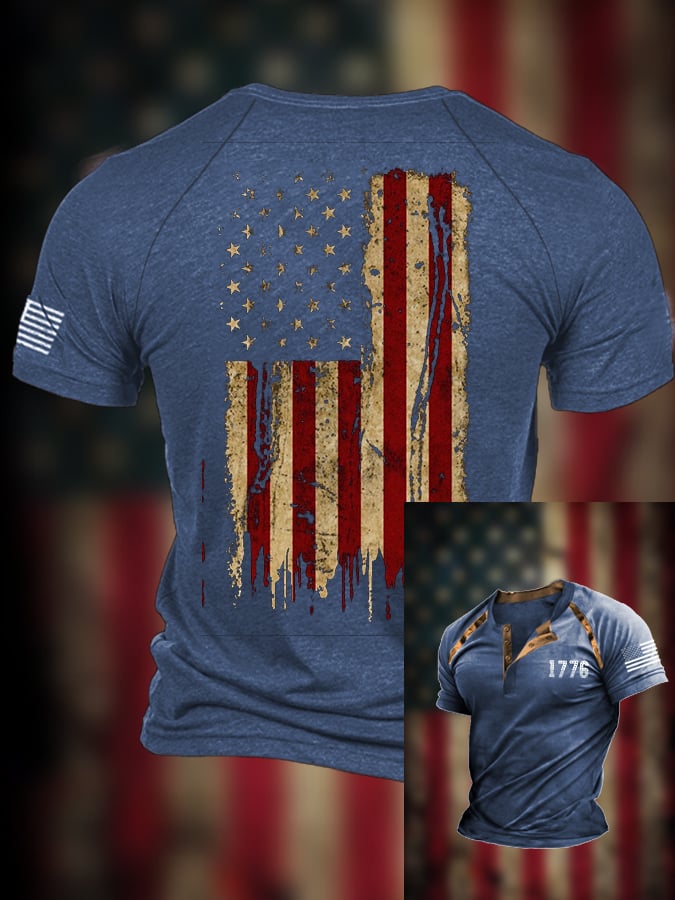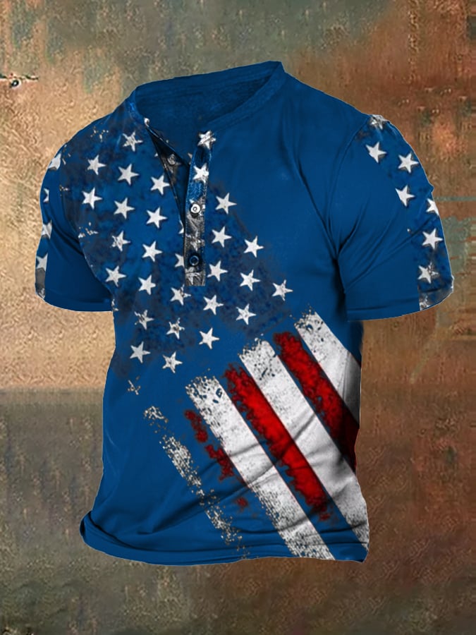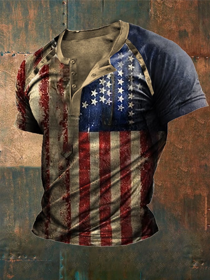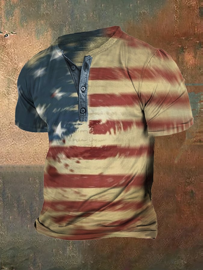 Men's Vintage Distressed Flag Independence Day Print Henley Neck T-Shirt