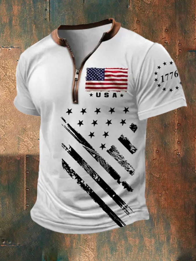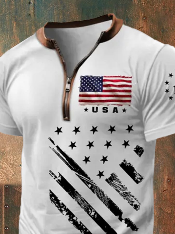 Men'S Vintage American Flag Print Zipper Henley Collar T-Shirt