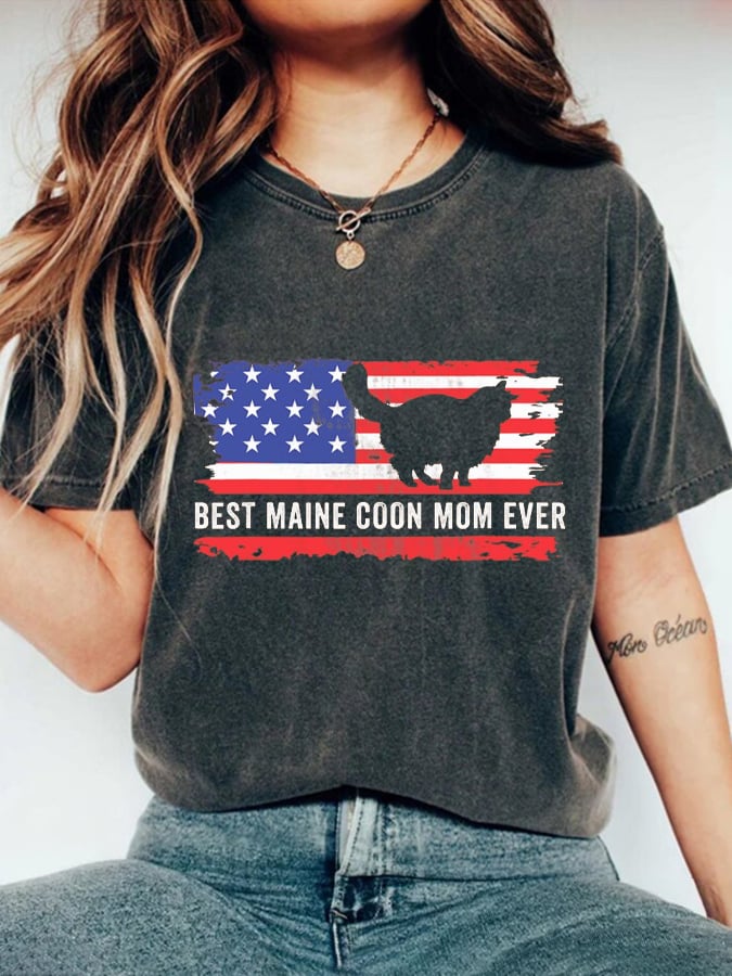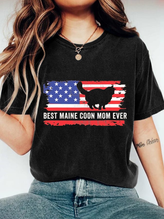 Women's Independence Day Cat Patriotic 4th of July American Flag Printed Retro T-Shirt