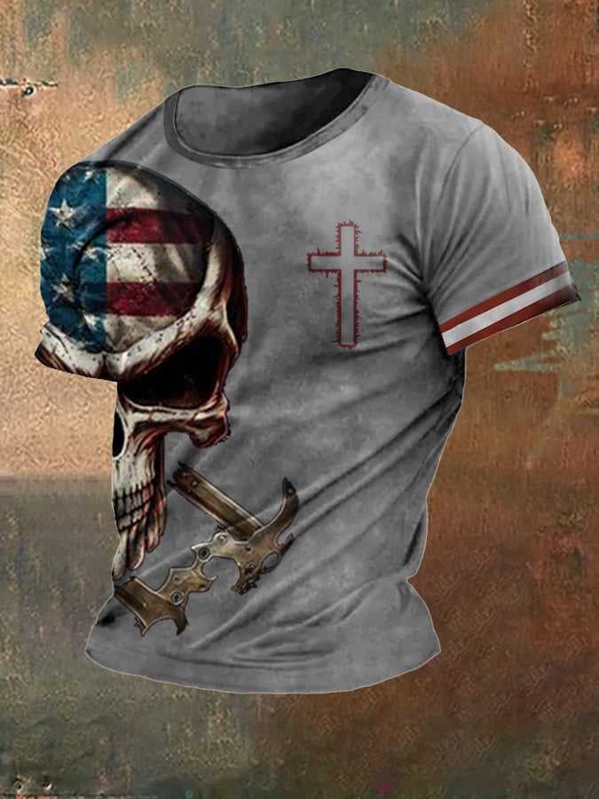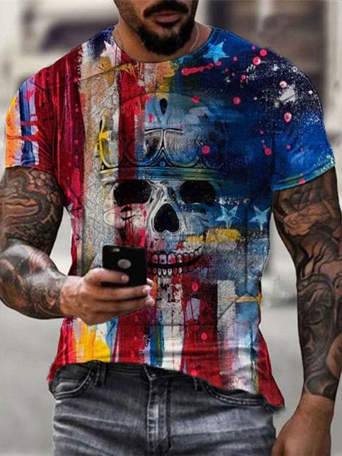 Men's Independence Day Oil Painting Skull Flag Print Casual T-Shirt
